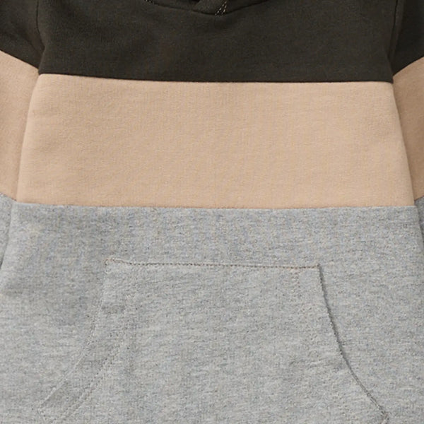 * Color blocked hooded long sleeve jumpsuit * Super soft cotton * Hooded colorblocked jumpsuit * Kangaroo pocket * Ribbed cuffs at arms and legs * 100% Organic Cotton